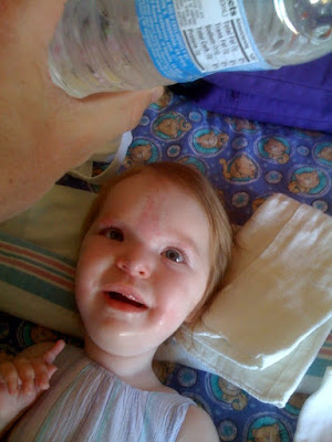 This is a picture of Gwendolyn waiting excitedly for the slow…building…3…2…1 countdown during the infamous “Attack of the Chilly Water Bottle” game. The water bottle flies around above her and dips in to get her on her tummy, neck, arms, legs… She loves the anticipation and, strangely enough, seems to like the coldness of the water bottle, too. She giggles and squeals every time the water bottle “gets” her. I just love that look of excitement on her face!